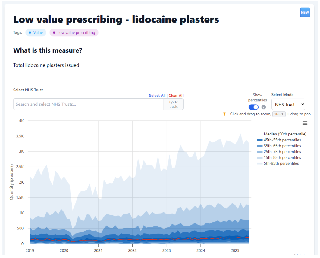 We’ve added two new measures: co-proxamol and lidocaine patches. Both are identified in  NHS England guidance as low value prescribing. While that guidance has mainly been aimed at primary care, we think it is important to also monitor a selection of these in hospitals - read more about why in our blog.