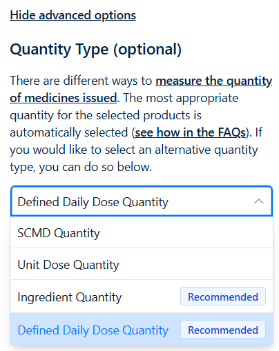 To avoid users having to decide on the most appropriate quantity type each time they want to run an analysis, we make a recommendation of the most appropriate choice based on the products that have been selected (you can read more about how we make that choice in our blog post, Choosing a quantity type for your analysis on OpenPrescribing Hospitals).