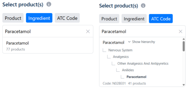 The first version of the Analyse feature supported searching by product name or code. This was fine for single product analyses, but for analyses of multiple products, we wanted to allow searching by other features of the product. You can now additionally search for products by the ingredients they contain, or where they appear in the Anatomical Therapeutic Chemical (ATC) classification. If you aren’t sure you can look up all of these details using the Product Lookup feature,