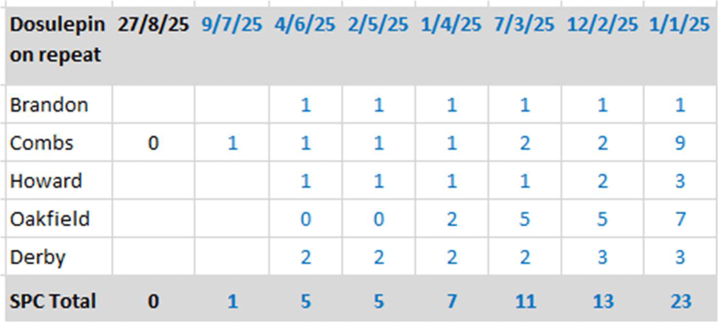 Using our well-established clinical safety framework, we were able to search for and identify patients from all of SPC’s practices who were still being prescribed dosulepin. All practices agreed to review their patients and discontinue the medication as a result of safety concerns. As many of the patients affected had been taking the medication for some time, a tailored approach for each individual was necessary.